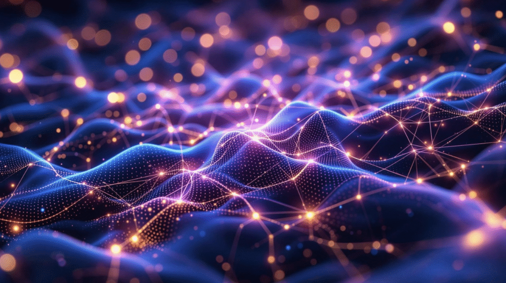 Visual & Artistic Style: Electric blues and infrared purples form neural filaments in a symmetrical weave; futuristic yet organic