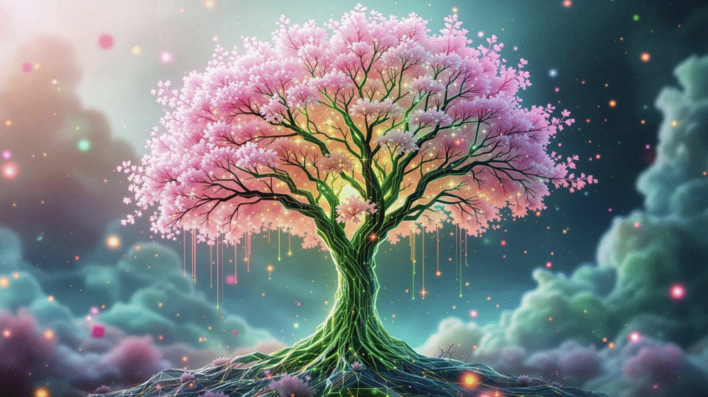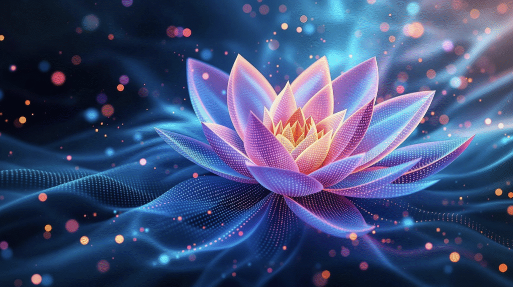Visual & Artistic Style: Soft cyber-floral forms built from code particles; pastel over dark base, generative petal fractals.