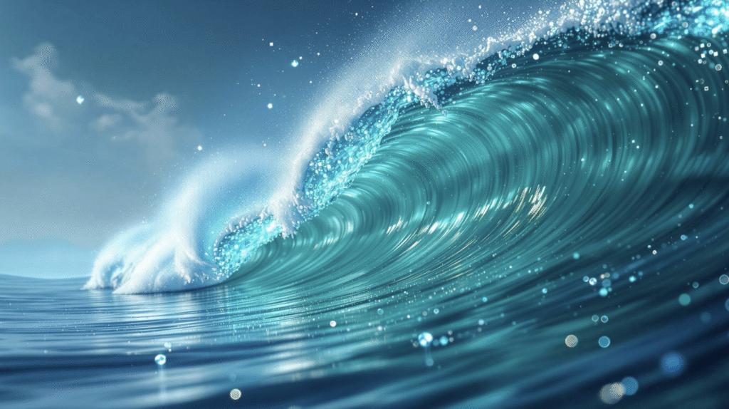 Visual & Artistic Style: Liquid metal waves under pixel skies; moody marine palette with holographic crests.