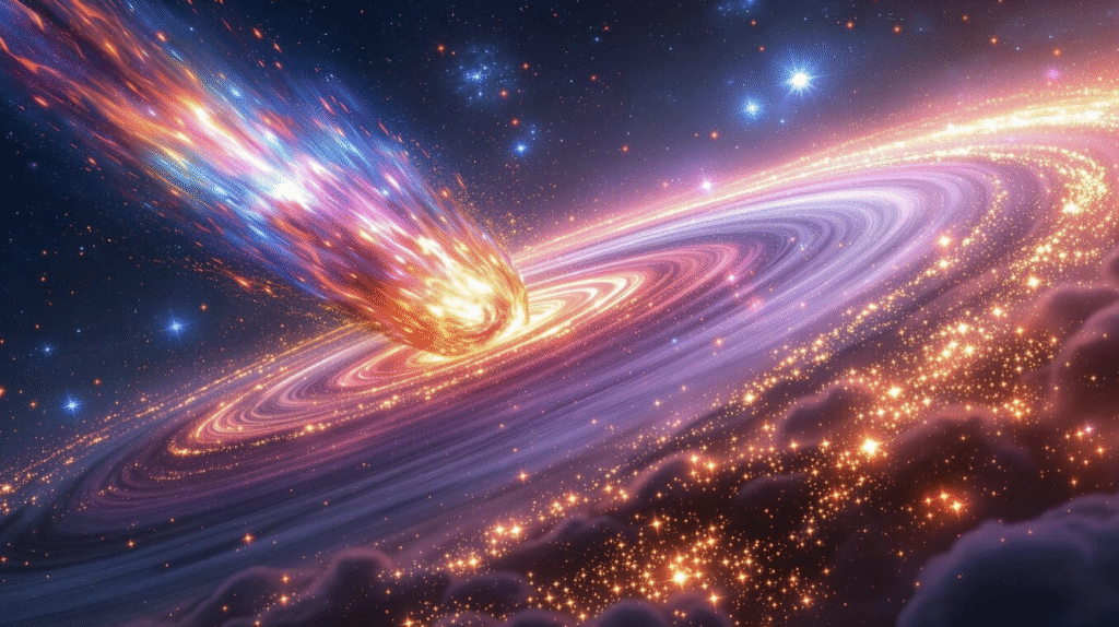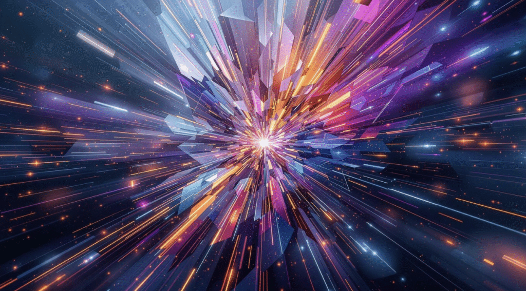 Visual & Artistic Style: Vortex burst of starlight with energy arcs; sharp radiant trails in indigo space.