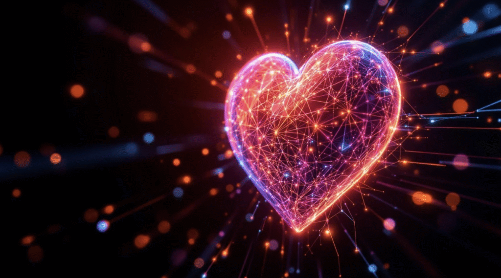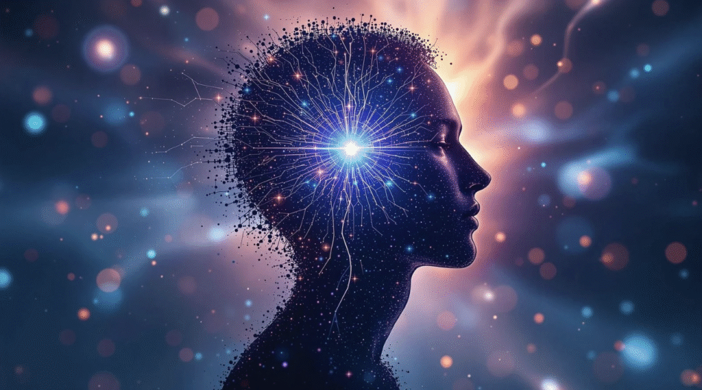 Visual & Artistic Style: Silhouette of a human aura inside pulsing code lattice; soft cyan and gold glow.