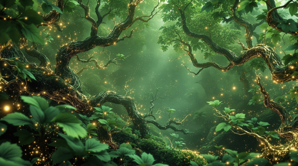Visual & Artistic Style: Tree silhouettes made from fine circuit traces; verdant greens with chrome roots.